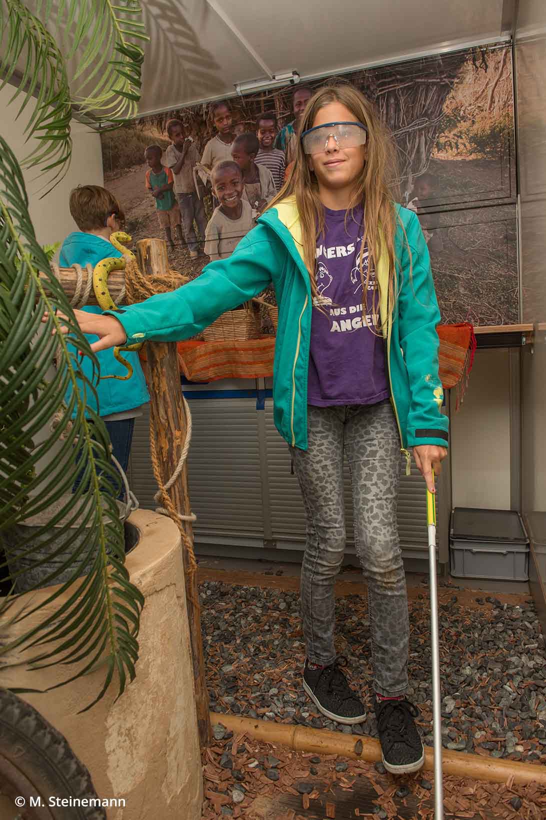 Unser Erlebnismobil ist ein Lieferwagen mit einem U-förmigen Gang. Wer durch diesen Gang geht, trägt eine Milchglasbrille. Diese Brille simuliert den Grauen Star, wenn er weit fortgeschritten ist. Der Graue Star ist eine Augenkrankheit und weltweit die häufigste Ursache für Blindheit.