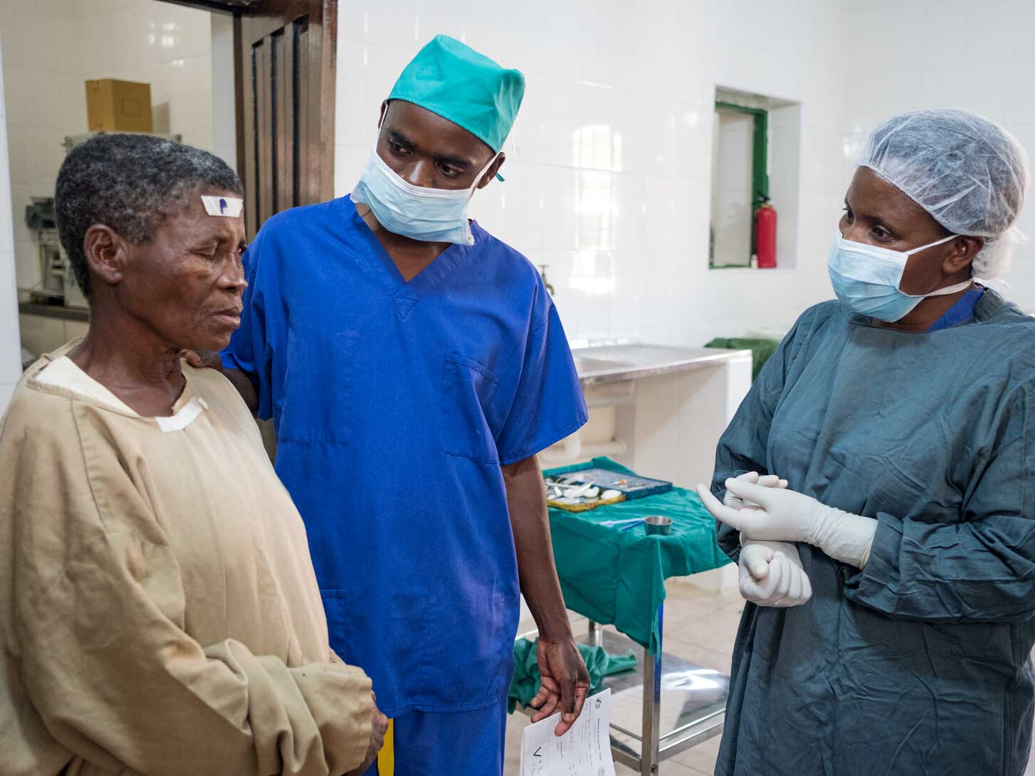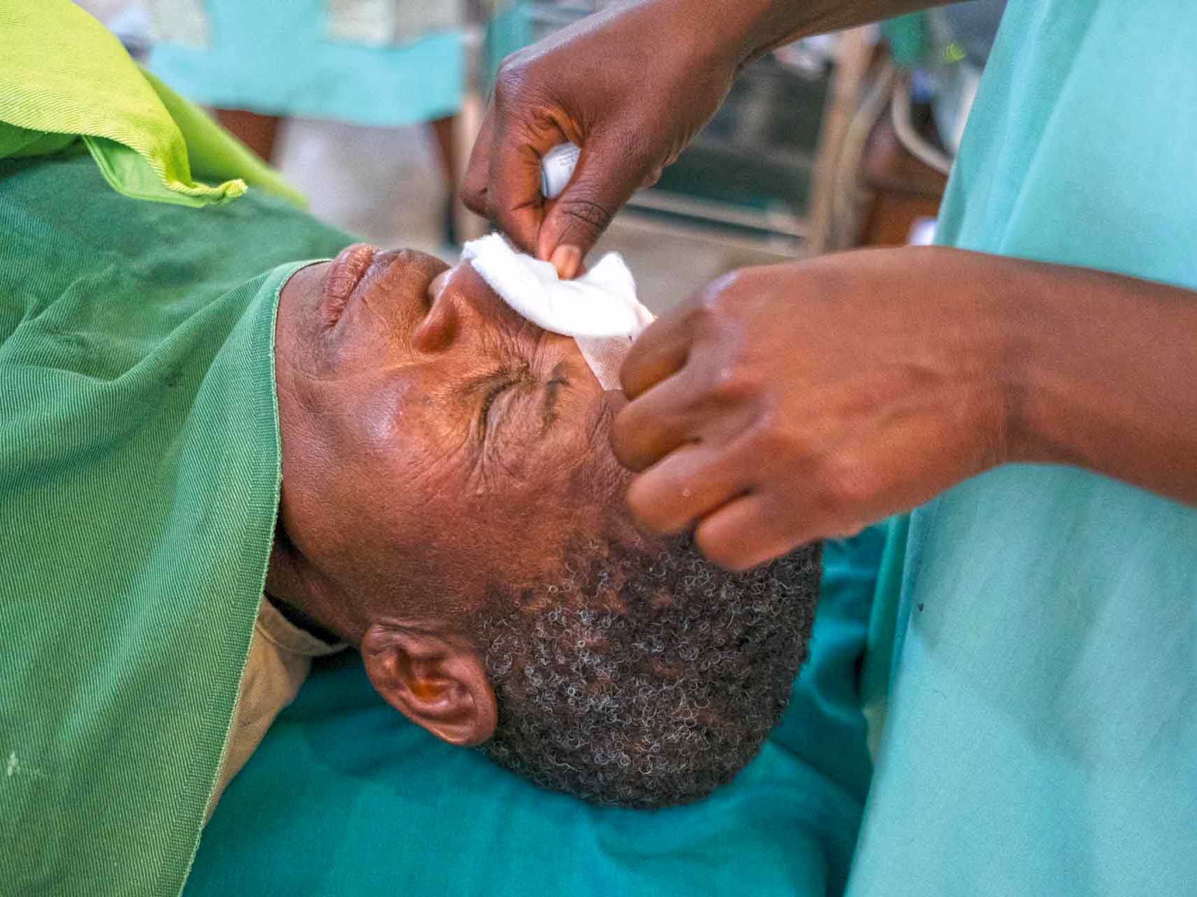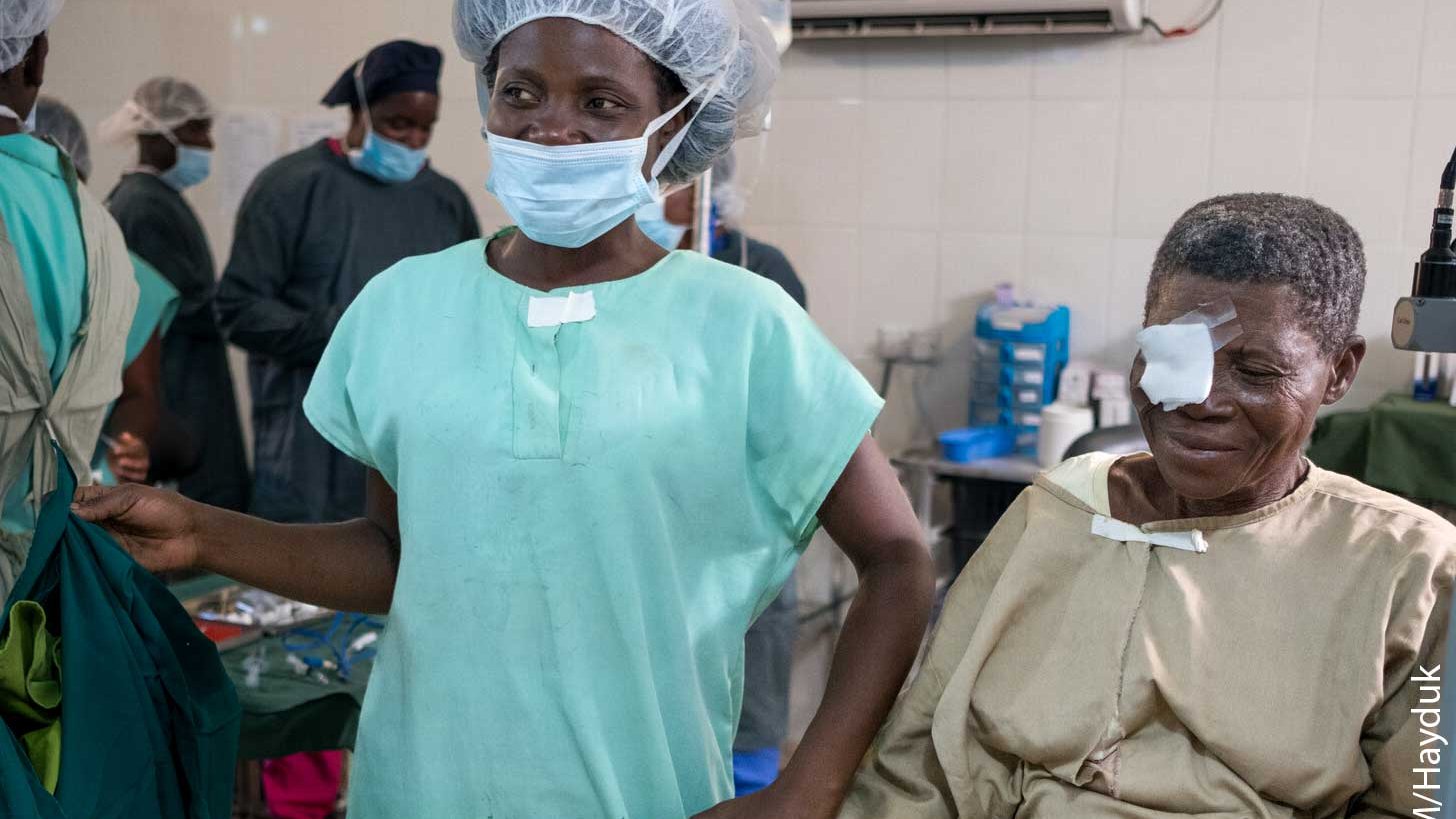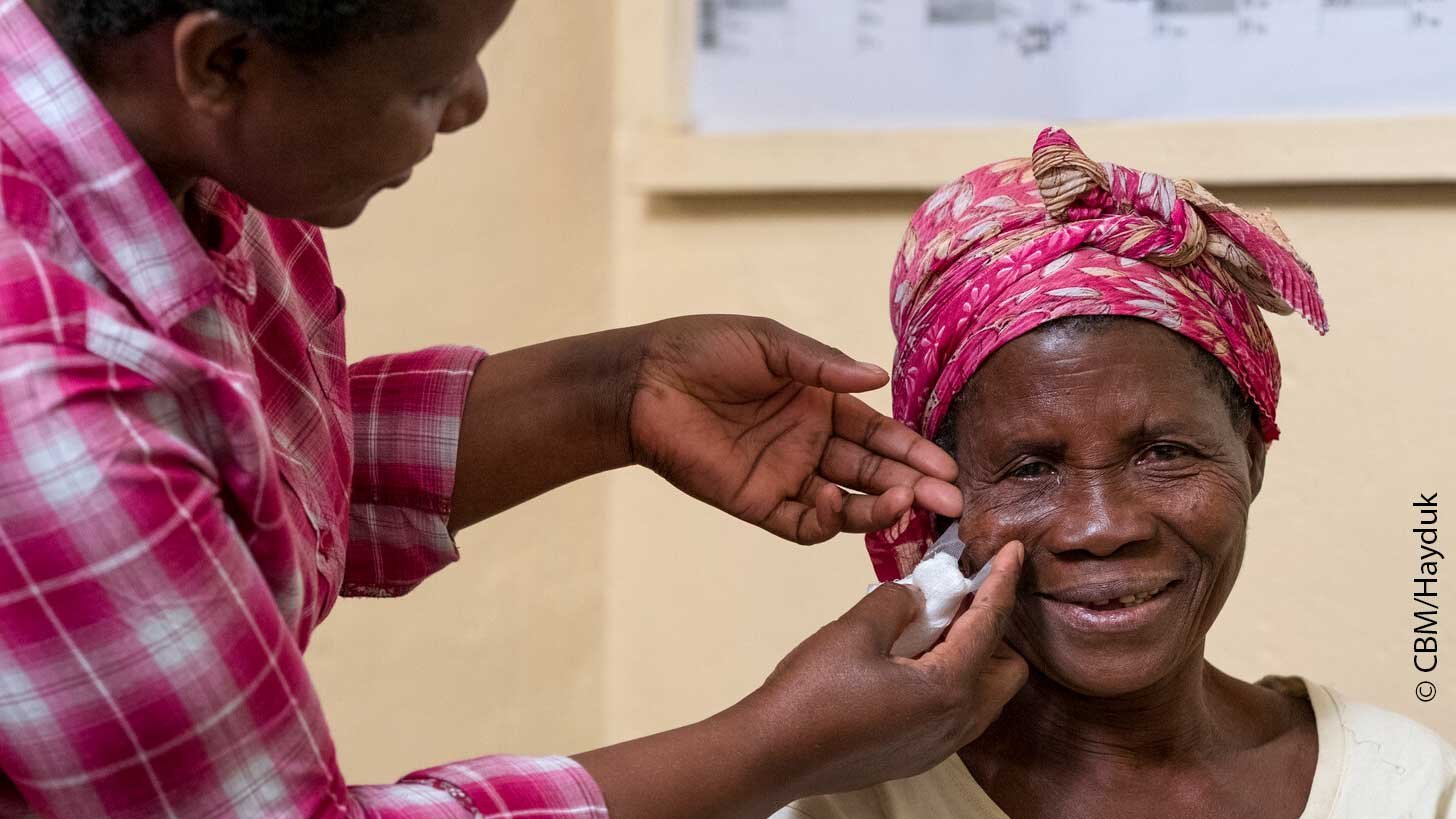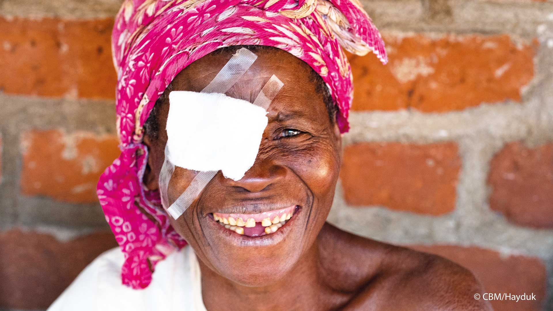 Die 56-jährige Lydia Maundé ist am Grauen Star erblindet und von ihrer Familie abhängig. Dank der CBM erhält sie eine Augenoperation. Noch etwas unsicher wird sie von einer Pflegerin in den OP-Saal geführt. Der Eingriff dauert pro Auge nur rund 15 Minuten. Aus der Klinik tritt eine selbstbewusste Frau, die ihr Leben wieder in die Hand nehmen kann.
