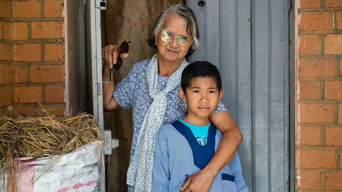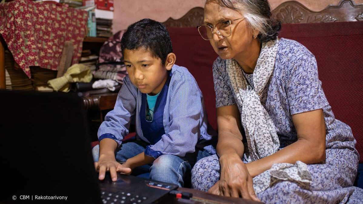 An der inklusiven Schule entfaltet Ranto sein Potenzial. Er hat sogar gelernt, den Schullaptop zu nutzen. Stolz zeigt er seiner Grossmutter, wie man ihn einrichtet und bedient.