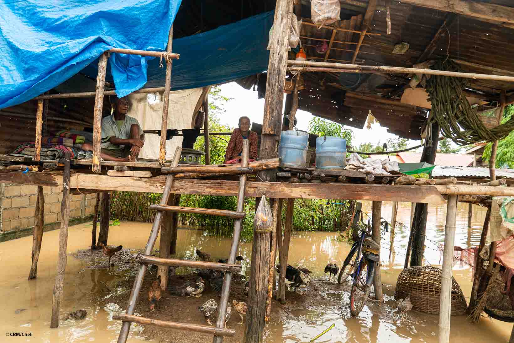 Acqua color ocra ricopre la strada e serpeggia fin sotto la piattaforma di legno che, senza pareti, è sorretta da pali a due metri di altezza. Galline e anatre si danno appuntamento sull’unica porzione di terreno non inondata, mentre un ragazzino con stivali troppo grandi affronta l’enorme pozzanghera.